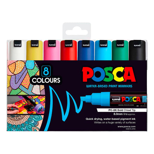 Posca PC-7M Marker Pens have broad 4.5-5.5mm bullet tips making them excellent for bold writing that stands out. This pack of 8 markers uses water-...